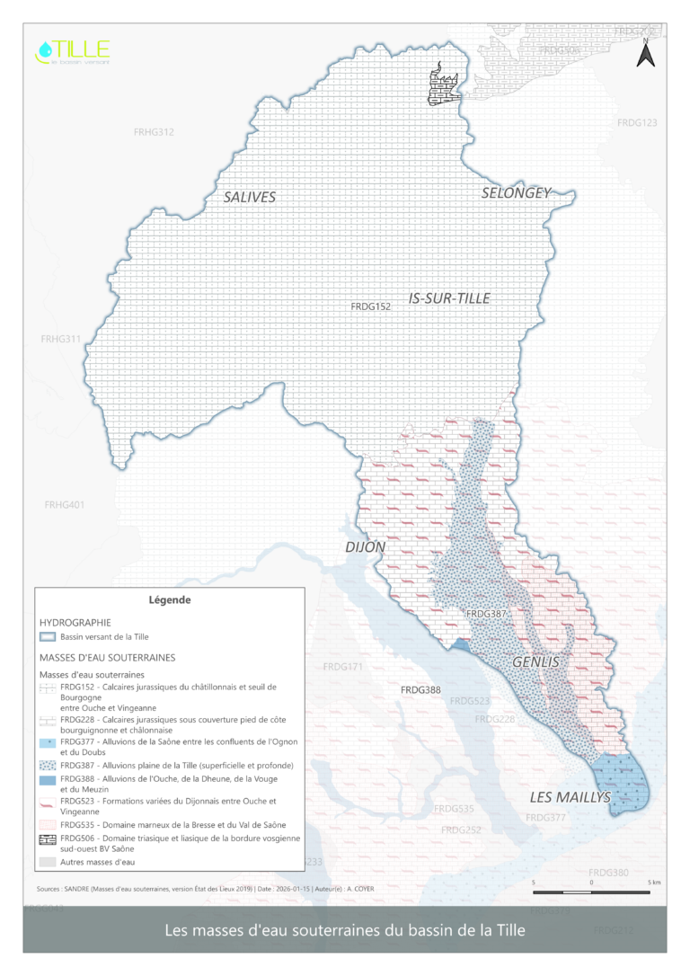 - La Tille : Son débit diminue progressivement de l’amont vers Til-Châtel, avec des étiages sévères entre Til-Châtel et Spoy. À l’aval, la rivière est réalimentée par la Norges.
