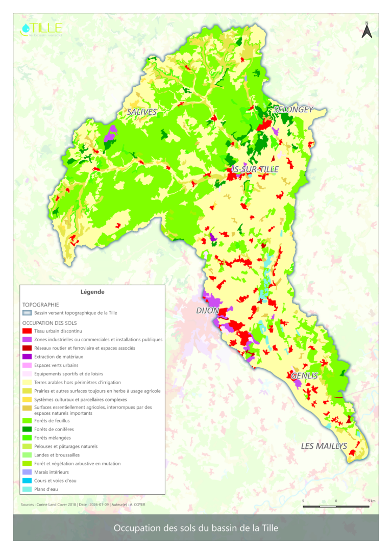 L’occupation du sol du bassin de la Tille est majoritairement marquée par les grandes cultures, qui représentent 54 % des surfaces. Les bois et forêts occupent environ 40 % du territoire. Les zones urbanisées (5,4%) ainsi que les gravières et plans d’eau (0.6%) complètent cette répartition.