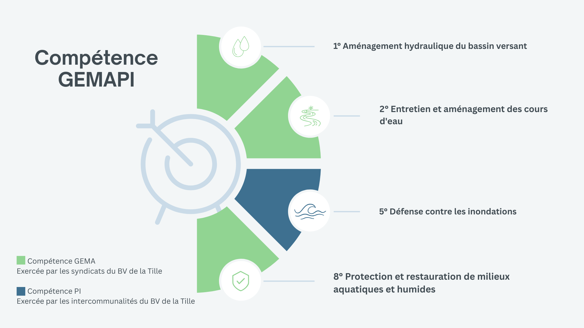 La compétence GEMAPI (Gestion des Milieux Aquatiques et Prévention des Inondations) regroupe les missions 1°, 2°, 5° et 8° prévues à l’Article L211-7 du Code de l’Environnement.